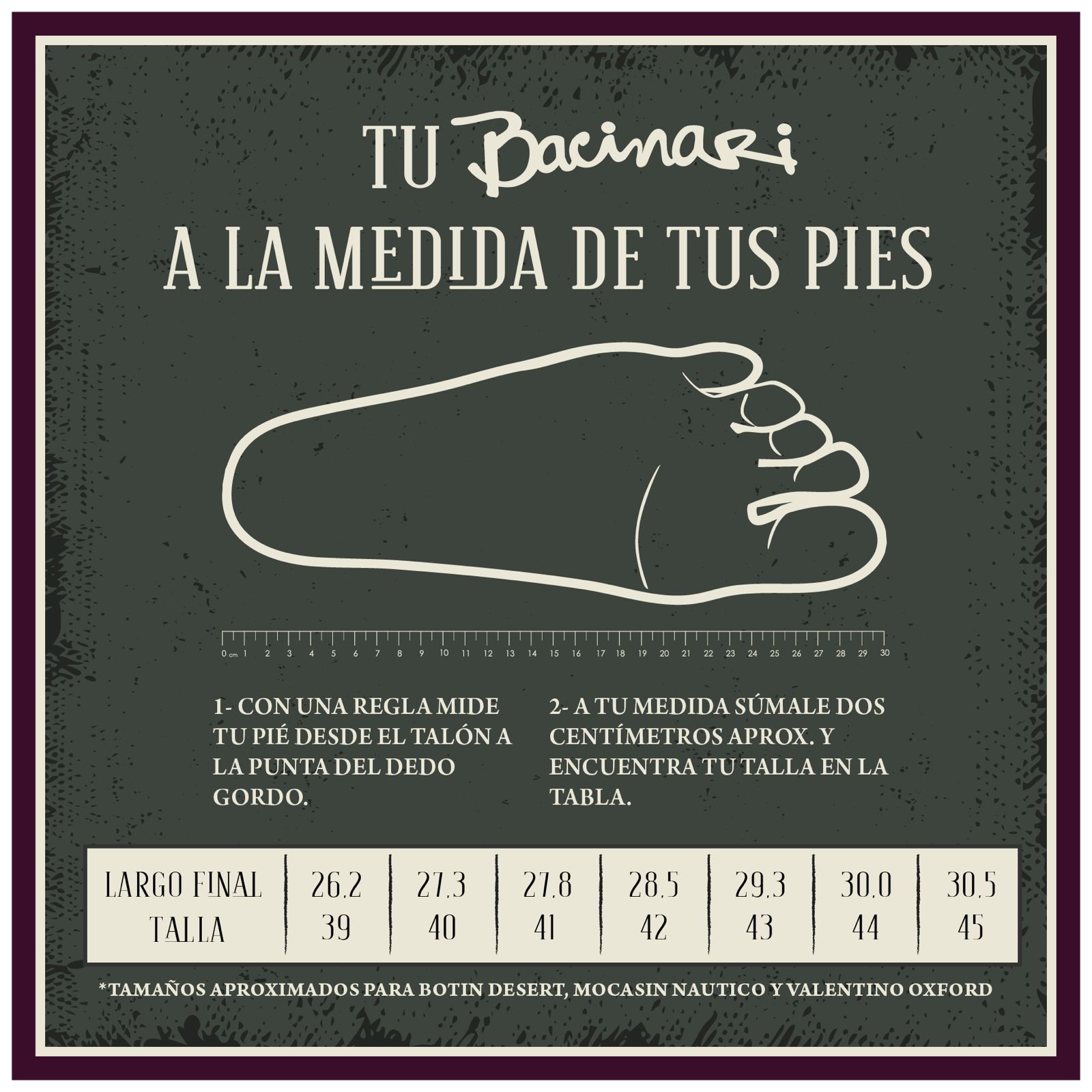 2 - Con una regla debes medir la longitud desde el talón al dedo más largo.